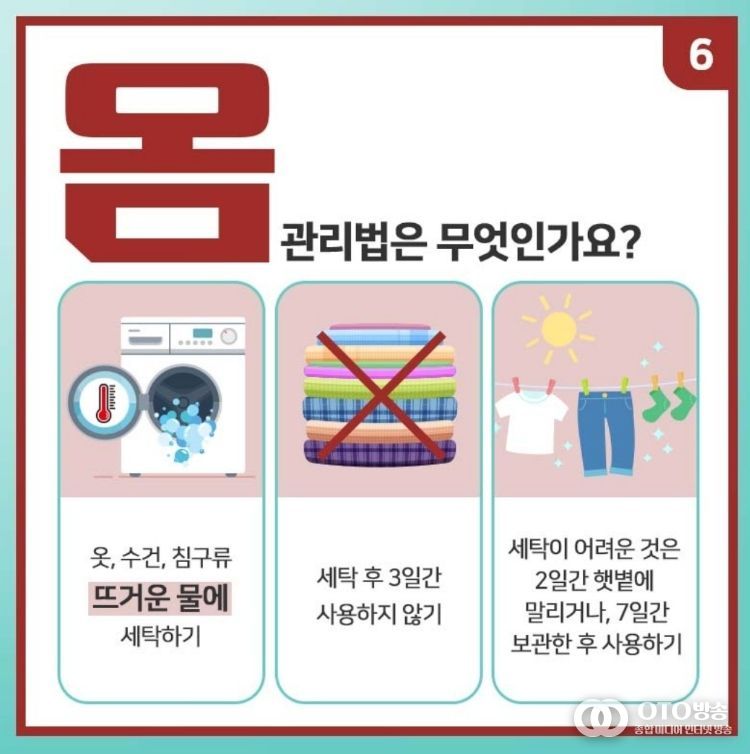 또한 가려움이나 발진 등 의심 증상이 있으면 즉시 의료기관 진료를 받고, 환자 발생 시에는 시설 내 신속한 보고와 접촉자 관리가 이루어져야 한다.