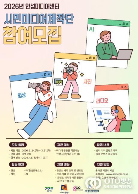 안성시 관계자는 “시민미디어제작단은 시민들이 자신의 이야기를 미디어 콘텐츠로 제작할 수 있도록 교육과 시설, 장비 등을 종합적으로 지원하는 사업”이라며 “올해는 특히 지역을 주제로 한 다양한 이야기를 콘텐츠로 제작해 지역사회와 소통하는 활동으로 자리매김할 수 있도록 운영할 계획”이라고 밝혔다.