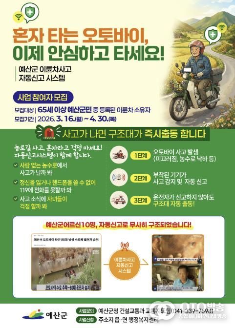 oto방송 김민석 기자 | 예산군은 이륜차사고 발생 시 자동 신고를 통해 신속한 구조를 지원하는 ‘이륜차사고 자동신고 시스템 운영’ 사업을 추진한다.