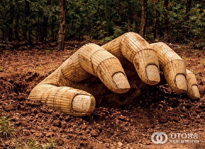 땅에서 솟아오르는 거대한 대나무 손은 인간의 고된 노동이 숭고한 생명 지탱의 몸짓으로 승화되는 상호성의 제스처를 상징하며, 대지가 살아있는 변형의 주체임을 시사한다.