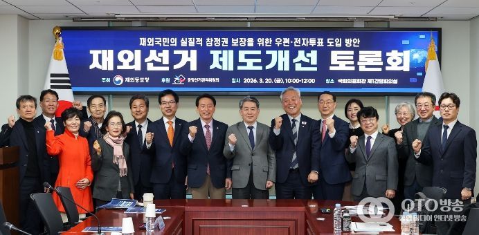 oto방송 김민석 기자 | 재외동포청은 3월 20일 오전 10시, 국회의원회관 제1간담회의실에서 ‘재외국민의 실질적 참정권 보장을 위한 우편·전자투표 도입방안’을 주제로 '재외선거 제도개선 토론회'를 개최했다.