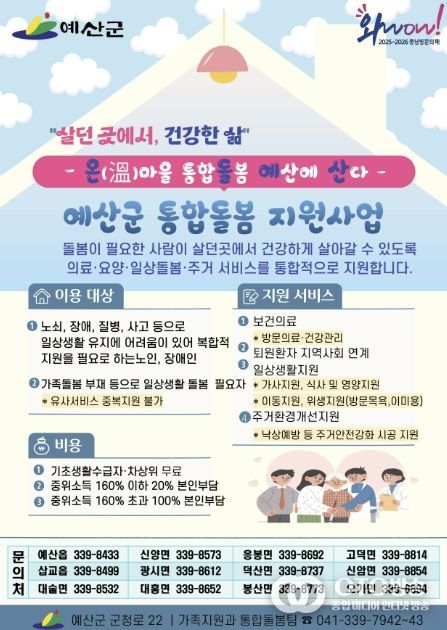oto방송 김민석 기자 | 예산군은 돌봄이 필요한 군민이 살던 곳에서 의료·요양·돌봄 서비스를 통합적으로 지원받을 수 있도록 ‘의료·요양 통합돌봄사업’을 3월 27일부터 본격 추진한다.