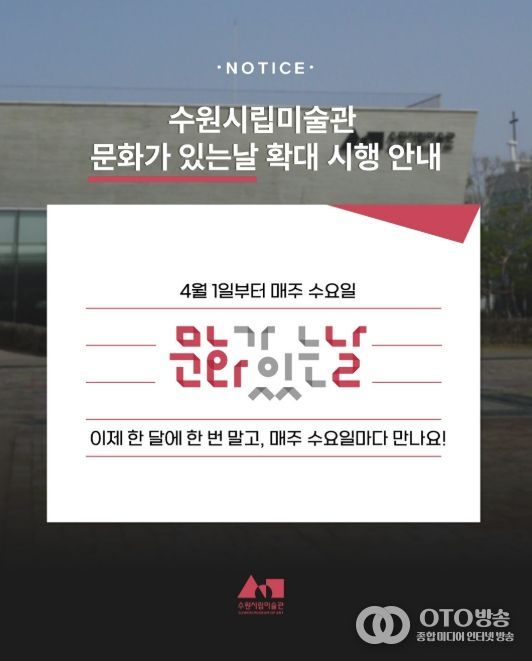 oto방송 김민석 기자 | 경기도 수원시립미술관은 4월 1일부터 ‘문화가 있는 날’ 운영을 기존 매월 마지막 주 수요일 1회에서 매주 수요일로 확대 운영한다.