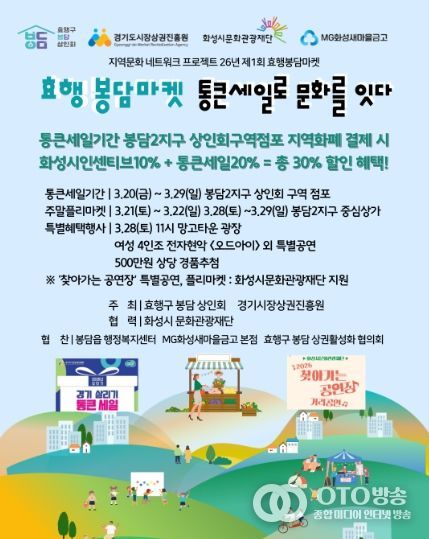 oto방송 김민석 기자 | 화성시문화관광재단(대표이사 안필연)은 효행구봉담상인회와 협력하여 ‘2026년 제1회 효행봉담마켓’을 오는 3월 28일 봉담망고타운 광장에서 개최한다고 밝혔다.
