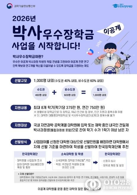 oto방송 김민석 기자 | 과학기술정보통신부와 한국장학재단은 2026년도 이공계 박사 우수장학금 사업을 올해 처음으로 시행한다고 밝혔다. 이공계 박사 우수장학금은 사업 참여를 신청한 대학원의 소속 학생 중 장학생을 선발하며, 대학원의 사업 참여 신청 기간은 4월 14일부터 4월 20일까지이다.