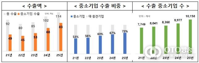 한편, 중소기업의 화장품 수출 규모는 2022년 44.7억 달러에서 2023년, 2024년에는 각각 53.2억달러, 68.5억 달러로, 그리고 2025년에는 83.2억 달러로 늘면서 매년 평균 23% 가까운 성장세를 이어오고 있다. 올해도 지난 2월까지의 수출액이 약 14억 달러로 이미 지난해 같은 기간의 수출액을 넘어서면서 이러한 흐름은 앞으로도 계속될 전망이다.