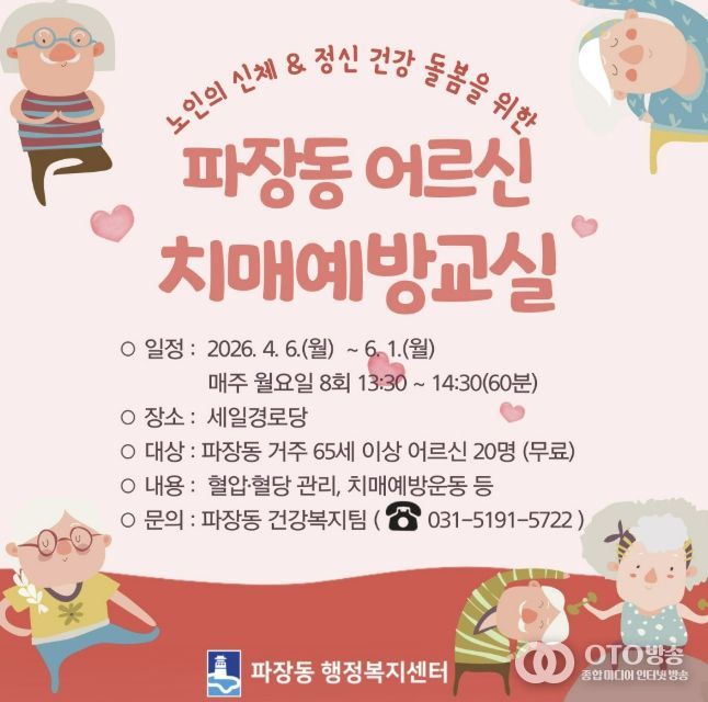 oto방송 김민석 기자 | 수원시 장안구 파장동은 관내 어르신들의 신체 및 정신건강 돌봄을 위해 ‘2026년 파장동 어르신 치매예방교실’을 장안구보건소 치매안심센터와 협업하여 운영한다고 밝혔다.