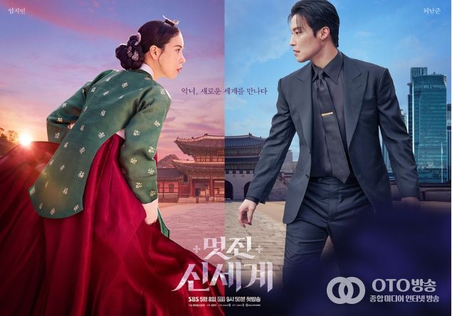 이 가운데 14일(화), ‘멋진 신세계’ 측이 ‘조선악녀’ 강단심(임지연 분)과 ‘악질재벌’ 차세계(허남준 분)의 운명적 조우를 그려낸 듀오 포스터를 공개해 이목을 집중시킨다. 공개된 포스터 속 두 사람은 같은 공간, 다른 시간 속에서 서로를 마주하고 있는 모습. 18세기 조선의 단심과 21세기 대한민국의 세계가 만들어낸 데칼코마니 구도가 흥미를 높인다. 두 사람 사이에는 상대의 신세계를 향한 호기심과 경계심, 운명적 이끌림이 느껴진다. 특히 단 한 번의 눈맞춤으로도 강렬한 아우라를 발산하는 이들의 케미스트리에 기대가 모인다.
