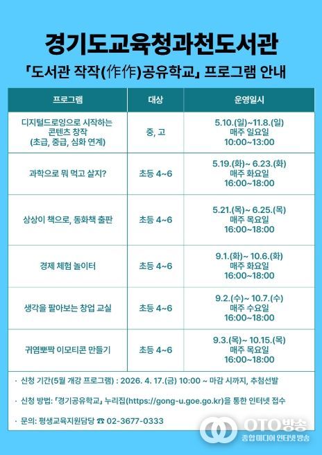 oto방송 김민석 기자 | 경기도교육청과천도서관이 학생들의 자기주도 학습 역량과 창의적 사고력 함양을 위해 ‘도서관 작작(作作) 공유학교’를 운영한다.
