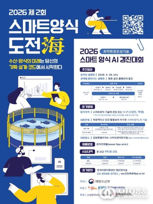 oto방송 김민석 기자 | 해양수산부와 한국어촌어항공단(이사장 홍종욱)은 4월 20일부터 5월 15일까지 ‘제2회 스마트양식 도전해(海) 경진대회’의 공모를 실시한다고 밝혔다.