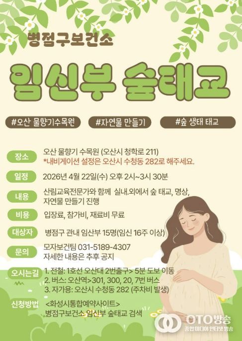oto방송 김민석 기자 | 화성특례시 병점구보건소는 임신부의 정서적 안정과 건강한 출산을 지원하기 위해 오는 22일 ‘임신부 숲태교 프로그램’을 운영한다고 밝혔다.
