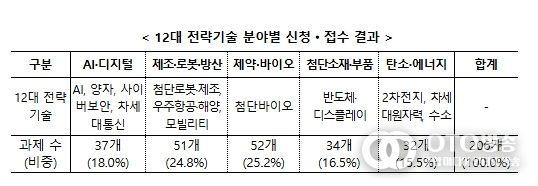 이번 공모는 12대 전략기술 분야를 중심으로 진행된 이번 공모는, 5대 전략기술 그룹 단위로는 제약·바이오 분야에 52개(25.2%), 제조·로봇·방산에 51개(24.8%), 인공지능(이하 AI)·디지털에 37개(18.0%) 등이 접수됐으며, 총 206개 접수 과제에 1,183개 기업·연구소 등이 참여 신청했다.