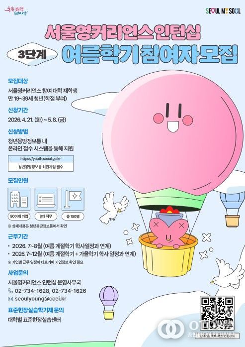 oto방송 김민석 기자 | 서울시가 국내 최초로 도입한 초기 청년 대상 단계별 취업 지원책인 ‘서울영커리언스 사업’의 3단계, 인턴십의 여름학기 참여자 150명을 모집한다고 밝혔다.