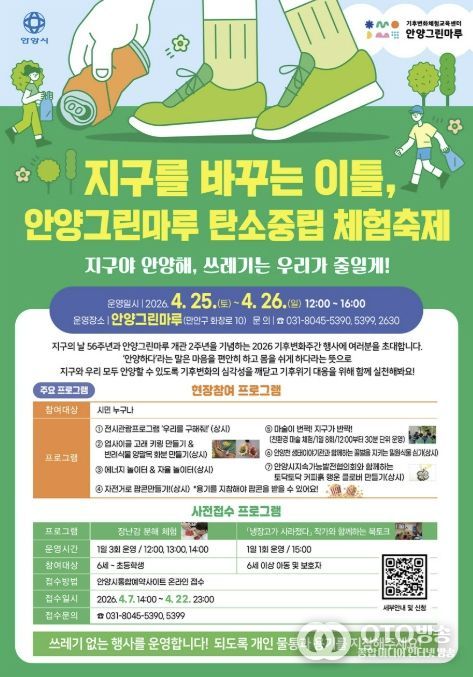 oto방송 김민석 기자 | 안양시는 제56회 지구의 날(4월 22일)을 맞아 기후위기 대응과 탄소중립 생활 실천 확산을 위한 기후변화주간(4월20~26일)을 운영하고 있다고 22일 밝혔다.