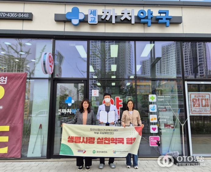 oto방송 김민석 기자 | 오산시정신건강복지센터 부설 자살예방센터는 지역사회 기반 생명존중 문화 확산과 자살예방 체계 강화를 위해 지난 20일과 21일 이틀간 관내 약국 4곳과 ‘생명사랑약국’ 업무협약을 체결했다고 밝혔다.