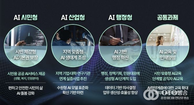 ‘시민 모두의 인공지능 기본권 실현’, ‘인공지능 산업생태계 조성’, ‘인공지능 기반 행정 혁신’을 3대 목표로 설정하고, ▲인공지능(AI) 시민청 ▲인공지능(AI) 산업청 ▲인공지능(AI) 행정청 ▲인공지능 교육·인재 양성으로 분야를 나눠 인공지능 기반 사업을 추진한다.