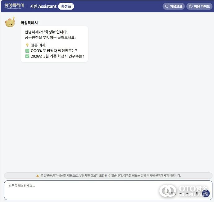 oto방송 김민석 기자 | 화성특례시는 시민 체감형 행정서비스 강화를 위해 23일부터 ChatGPT 기반 대화형 AI 검색 서비스 ‘화성in’을 정식 운영한다.