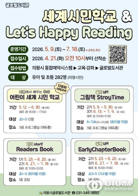 oto방송 김민석 기자 | 의왕시 글로벌도서관이 책을 통해 세상을 이해하고 체험하는 다문화 이해 프로그램 '어린이 세계 시민 학교'와 영어 읽기 문해력 향상을 위한 단계별 맞춤 프로그램 'Let’s Happy Reading'의 참여자를 모집한다.