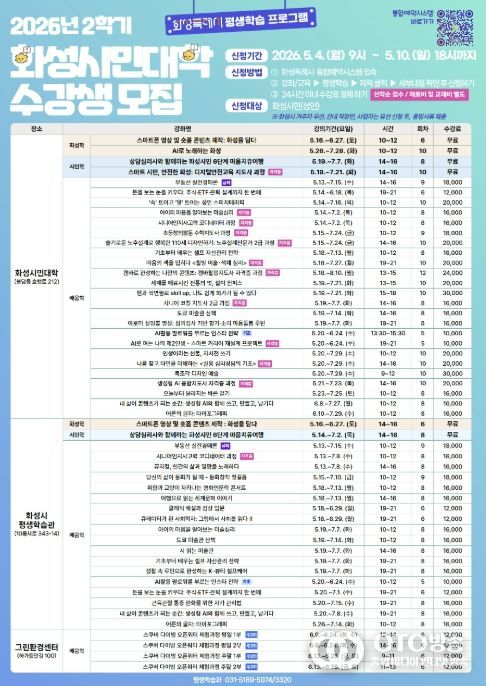 oto방송 김민석 기자 | 화성특례시는 2026년 화성시민대학 2학기 수강생을 오는 5월 4일부터 5월 10일까지 선착순으로 모집한다고 밝혔다.