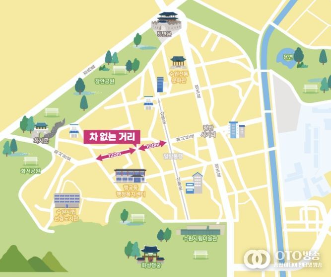oto방송 김민석 기자 | 수원시 행궁동 화서문로 34번지부터 신풍로 47번지까지 약 220m 구간이 5월부터 매주 토요일 ‘차 없는 거리’로 운영된다.