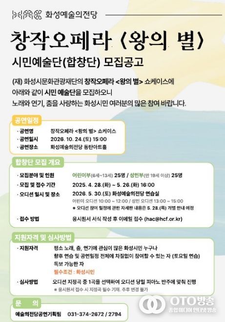 oto방송 김민석 기자 | (재)화성시문화관광재단은 오는 10월 개최 예정인 창작오페라 '왕의 별' 쇼케이스 무대에 참여할 시민합창단을 모집한다.