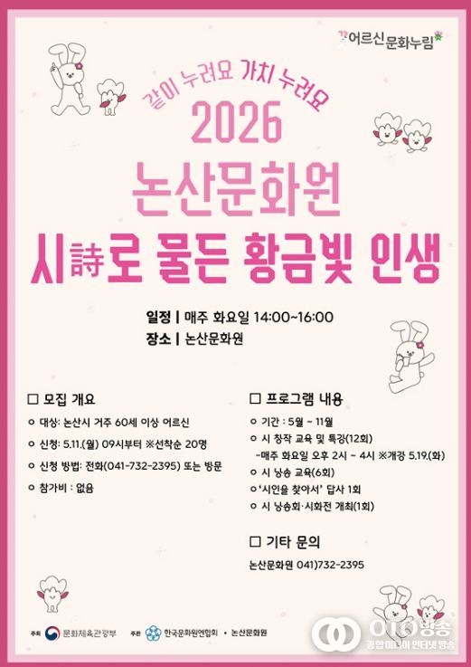 논산문화원 관계자는 “이번 사업은 문화체육관광부가 주최하는 한국문화원연합회 '취약지역 어르신 문화누림' 공모사업 선정을 통해 지역 어르신들에게 보다 수준 높은 문화예술 프로그램을 제공할 수 있게 됐다”며 “참여자들이 자신의 인생을 시로 표현하며 삶의 의미를 되새기고 지역사회와 소통하는 뜻깊은 시간이 되길 기대한다”고 밝혔다.