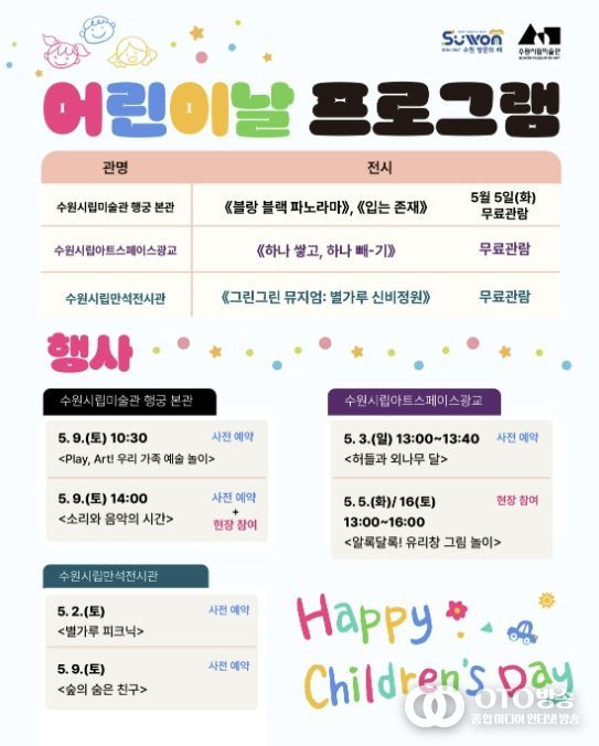 수원시립미술관 남기민 관장은 “어린이날을 맞아 다양한 전시와 프로그램을 통해 미술관의 문턱을 낮추고 다채로운 체험과 추억을 만드는 시간이 되길 바란다”라고 밝혔다.