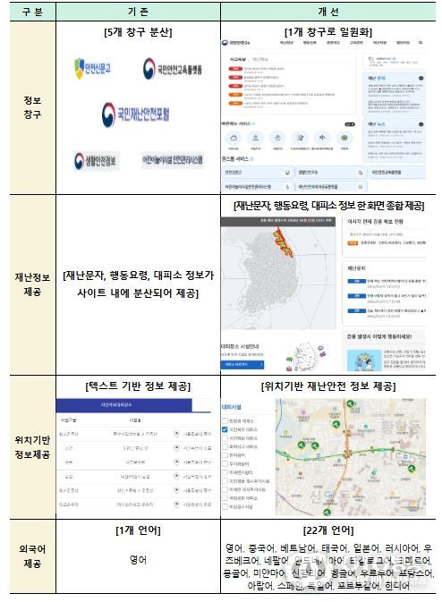 기상특보나 사고정보 등 실시간 재난상황 정보를 제공하는 재난 유형은 기존 9종에서 26종으로 확대된다. 특히 재난별 상황정보, 재난문자, 대피소 위치, 국민행동요령을 통합 안내함으로써 위기 상황에서 국민이 신속하게 대처할 수 있도록 돕는다.