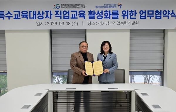 oto방송 김민석 기자 | 경기도화성오산교육지원청이 특수교육대상 학생들의 진로직업교육 강화를 위해 한국장애인고용공단 경기남부직업능력개발원과 협력에 나선다. 경기도화성오산교육지원청은 오는 3월 18일 한국장애인고용공단 경기남부직업능력개발원에서 특수교육대상자 진로직업교육 협력을 위한 업무협약(MOU)을 체결한다고 밝혔다. 이번 협약은 고등학교 특수교육대상학생을 대상으로 지역사회와 연계한 진로·직업교육 프로그램을 공동 운영하고, 현장 중심 교육을 확대하기 위해 마련됐다. 협약에 따라 두 기관은 ▲지역연계 진로직업교육 프로그램 기획·운영·평가 ▲교육시설 및 장비, 인적 자원 지원 ▲학생 안전관리 협력 ▲지역사회 연계 교육 콘텐츠 개발 등 다양한 분야에서 협력을 추진할 예정이다. 이번 협약의 중심 사업인 화성오산 고등학교 특수교육대상자‘일배움 과정’ 프로그램은 관내 50학급의 약 340여 명의 특수교육대상자가 참여할 예정이다. 특히 이번 프로그램에는 ▲보미(Bomi) 로봇을 활용한 디지털 상호작용 학습 ▲드론 축구를 통한 공간 지각 및 협동 활동 ▲지게차·굴착기 모션 시뮬레이터 체험 등 미래 직