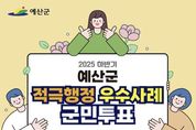 oto방송 김민석 기자 | 예산군은 2025년 하반기 적극행정 우수공무원 선발을 위해 4월 1일부터 7일까지 7일간 온라인 군민투표를 실시한다고 밝혔다. 군은 적극적인 업무 추진으로 공공의 이익 증진에 기여하고 공직사회에 적극행정 문화를 확산하기 위해 매년 상하반기 적극행정 우수공무원 선발을 추진하고 있다. 군민투표는 1차 내부 실무평가단 심사를 통과한 적극행정 사례 18건 중 2건에 투표하는 방식으로 진행되며, 정보무늬(QR코드) 접속 또는 군 누리집 ‘군민참여-설문조사’ 코너에서 본인인증 후 참여할 수 있다. 군은 실무심사와 군민투표, 적극행정위원회 심사 점수를 합산해 4월 중 적극행정 우수공무원을 선발하고 인사상 우대 조치와 함께 포상금을 지급할 계획이다. 군 관계자는 “현장의 다양한 목소리를 정책에 반영하고 적극행정을 더욱 활성화하기 위해 우수공무원 선발에 많은 관심과 참여를 부탁드린다”고 당부했다.