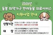 oto방송 김민석 기자 | 수원특례시는 돌봄 취약가구의 반려동물 양육 부담을 덜고 동물복지를 강화하기 위해 ‘2026년 돌봄 취약가구 반려동물 의료서비스 지원사업’을 추진한다. 지원 대상은 수원시에 주민등록을 두고 실제 거주하며 본인 명의로 반려동물을 등록해 기르는 기준중위소득 85% 이하 가구다. 저소득층, 중증장애인, 한부모가정, 다문화가정, 1인가구 등이 포함된다. 경기도 공공입양기관에서 국가봉사동물을 입양한 경우는 소득과 관계없이 지원한다. 보호자 1명당 2마리까지 신청할 수 있다. 동일 동물은 ‘의료·돌봄·장례 지원’ 또는 ‘노령동물 종합건강검진’ 중 한 가지 항목만 선택해 지원한다. 의료·돌봄·장례 지원은 마리당 최대 16만 원(초과비용 자부담), 노령동물 종합건강검진은 최대 32만 원(초과비용 자부담)까지 지원한다. 노령동물 검진은 2019년 12월 31일 이전 출생한 반려동물에 한한다. 의료지원에는 백신접종, 중성화수술, 기본검진·치료비 등이 포함되고, 돌봄 위탁비와 장묘 서비스도 지원한다. 노령 반려동물은 종합건강검진을 받을 수 있으며 모든 서비스는 관내 업체를 이용해야 한다. &n