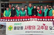 oto방송 김민석 기자 | 오산시 중앙동은 지난 30일 새마을지도자 중앙동 부녀회가 지역 내 어려운 이웃을 위해 직접 담근 고추장 90통을 전달했다고 밝혔다. 이번 나눔은 새마을부녀회 회원들이 재료 준비부터 담그기까지 전 과정에 직접 참여해 정성을 더했으며, 관내 저소득층 가구에 전달되어 식생활 지원은 물론 이웃의 따뜻한 관심과 온기를 함께 전하는 계기가 될 것으로 기대된다. 중앙동 새마을부녀회는 매년 고추장과 삼계탕 등 다양한 먹거리 나눔 활동을 통해 이웃사랑을 실천하며 지역사회에 따뜻한 변화를 만들어가고 있다. 심옥자 중앙동 새마을부녀회장은 “회원들의 정성과 마음을 모아 준비한 만큼 이웃들에게 작은 힘이 되길 바란다”며 “앞으로도 지속적인 나눔 활동을 이어가겠다”고 말했다. 백경희 중앙동장은 “항상 이웃을 먼저 생각하며 실천해 주시는 새마을부녀회에 깊이 감사드린다”며 “소중한 나눔이 꼭 필요한 곳에 전달될 수 있도록 최선을 다하겠다”고 밝혔다.