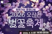 oto방송 김민석 기자 | 오산문화재단은 오는 4월 3일 오후 6시 30분 오산천 야외무대(종합운동장 뒤편)에서 시민들과 함께하는 봄맞이 ‘2026 오산천 벚꽃 축제’를 개최한다. 이번 행사는 따뜻한 봄의 시작을 알리며 시민들에게 특별한 추억을 선사하기 위해 마련된 것으로, 가수 황민호의 축하 공연을 비롯해 점등식과 폭죽 퍼포먼스가 어우러져 오산천 일대를 화려한 봄밤의 분위기로 물들일 예정이다. 행사 당일에는 음악과 빛, 불꽃이 조화를 이루는 다양한 프로그램이 진행되며, 남녀노소 누구나 함께 즐길 수 있는 열린 문화행사로 시민들의 큰 호응이 기대된다. 오산문화재단 관계자는 “오산천에서 펼쳐지는 이번 축제가 시민들에게 특별한 봄밤의 추억으로 남길 바란다”며 “앞으로도 시민들이 일상 가까이에서 문화와 예술을 향유할 수 있도록 다양한 프로그램을 지속적으로 마련하겠다”고 밝혔다.