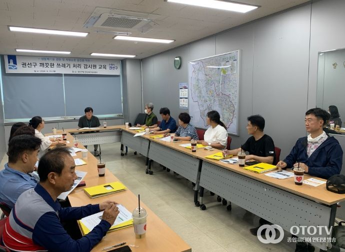 oto방송 김민석 기자 | 권선구 환경위생과는 10일 권선구 깨끗한 쓰레기 처리 감시원 11명을 대상으로 생활폐기물 감량과 자원순환 증진을 위한 올바른 분리배출 요령 등 교육을 시행했다.