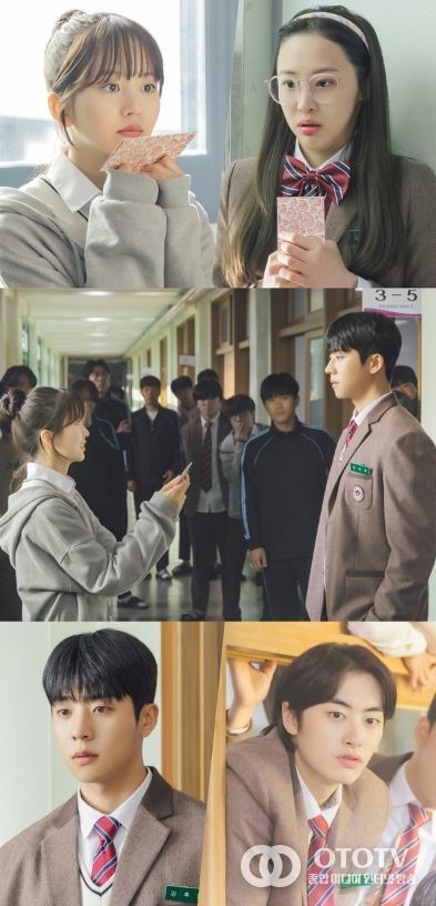 이날 공개된 사진은 이홍주, 강후영, 김혜지, 권상필의 엇갈린 첫사랑을 예고한다. 떠들썩하게 모여든 남학생들 사이로 강후영에게 러브레터를 건네는 ‘위풍당당’ 이홍주의 모습이 호기심을 자극한다.