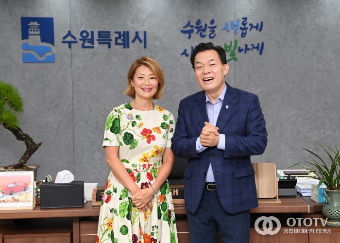 oto방송 김민석 기자 | 이재준 수원시장이 17일 집무실에서 엘렌 박(Ellen Park) 미국 뉴저지주 하원의원을 만나 수원시와 뉴저지주의 교류협력 방안을 논의했다.