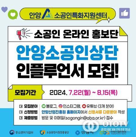 oto방송 김민석 기자 | 안양산업진흥원은 지난 22일부터 다음 달 15일까지 관내 소공인 제품을 시민들의 사회관계망(SNS)를 통하여 홍보하는 온라인 홍보단 ‘안양 소공인 상단’에 참여할 인플루언서를 모집한다고 23일 밝혔다.