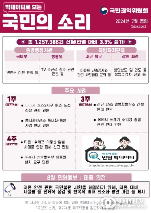이와 함께 국민권익위는 지난 한 달 동안 민원분석시스템에 수집된 7월 민원빅데이터 동향을 발표했다.