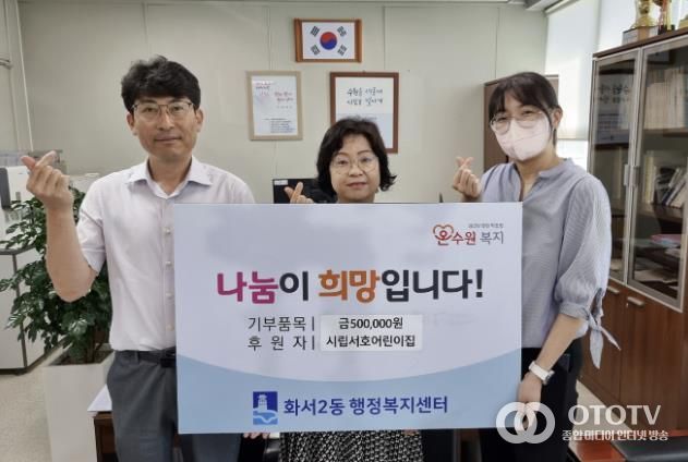 oto방송 김민석 기자 | 수원특례시 팔달구 화서2동에 위치한 시립서호어린이집은 지난 30일 직원들이 십시일반 모은 성금 50만원을 화서2동 행정복지센터에 기탁했다.