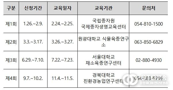 교육운영 방식은 전년도 교육 수료자들의 의견을 반영하여 집합(24일)과 온라인교육(25일)을 병행하여 운영되며 교육 신청자는 관련 세부 사항 및 일정(교육신청: 1.26~2.9)을 국제종자생명교육센터 누리집에서 확인할 수 있다.