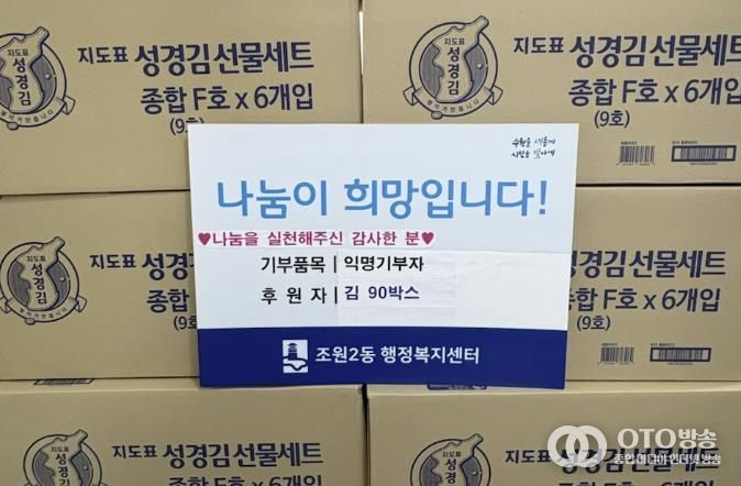 oto방송 김민석 기자 | 수원시 장안구 조원2동은 지난 3일, 설 명절을 맞아 익명의 기부자가 김 81박스를 기탁해 지역사회에 따뜻한 온정을 전했다고 밝혔다.