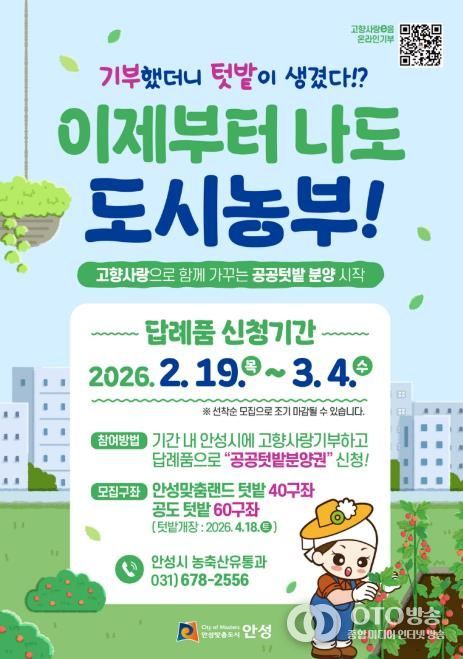 oto방송 김민석 기자 | 안성시는 오는 2월 19일부터 고향사랑기부제를 통해 도시농업을 체험하는 ‘도시농부’를 모집한다고 밝혔다.