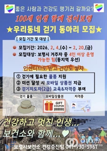 oto방송 김민석 기자 | 보령시는 주민의 신체활동 증진과 건강한 생활습관 형성을 위해 ‘우리동네 걷기동아리’ 참여 팀을 오는 20일까지 모집한다.