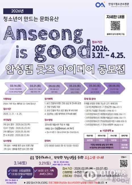 oto방송 김민석 기자 | 안성시청소년수련관은 청소년이 지역 문화유산을 창의적인 굿즈로 재해석하는 '2026 청소년이 만드는 문화유산 ‘안성템 굿즈 아이디어 공모전’'을 개최하고, 오는 3월부터 참가 청소년을 모집한다고 밝혔다.