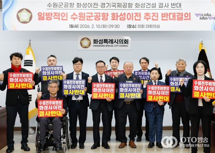 oto방송 김민석 기자 | 화성특례시의회 수원 군공항 화성시 이전 반대 특별위원회는 10일 대회의실에서 수원시의 『수원군공항 이전 국가전략사업 추진』 및 『범정부 수원군공항 이전 TF 구성』 건의에 대한 반대 규탄 결의문을 발표했다.