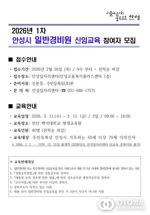 oto방송 김민석 기자 | 안성시는 관내 구직자의 안정적인 일자리 창출을 위해 오는 2월 26일부터 '2026년 제1차 안성시 일반경비원 신임 교육' 교육생을 모집한다고 밝혔다.
