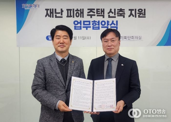 oto방송 김민석 기자 | 화성특례시는 11일 시청 총괄기획단회의실에서 화성·오산지역건축사회와 함께 재난 피해 주택의 신속한 복구와 시민의 조기 주거 안정을 지원하기 위한 업무협약을 체결했다.