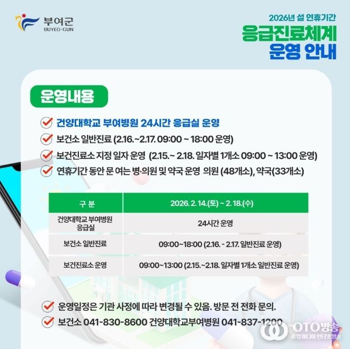 oto방송 김민석 기자 | 부여군은 다가오는 설 연휴 기간(2월 14일~ 2월 18일) 동안 군민의 의료 공백을 최소화하고 응급상황에 신속하게 대응하기 위해 연휴 응급진료체계를 가동한다고 밝혔다.