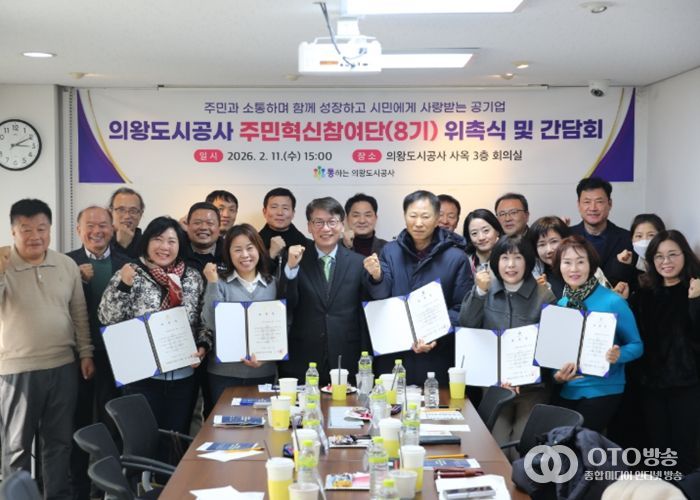 oto방송 김민석 기자 | 의왕도시공사가 지역주민과 고객들의 경영 참여 확대와 소통 강화를 위해 2월 11일 본사 3층 회의실에서 「2026년 주민혁신참여단 8기 위촉식 및 간담회」를 개최했다.