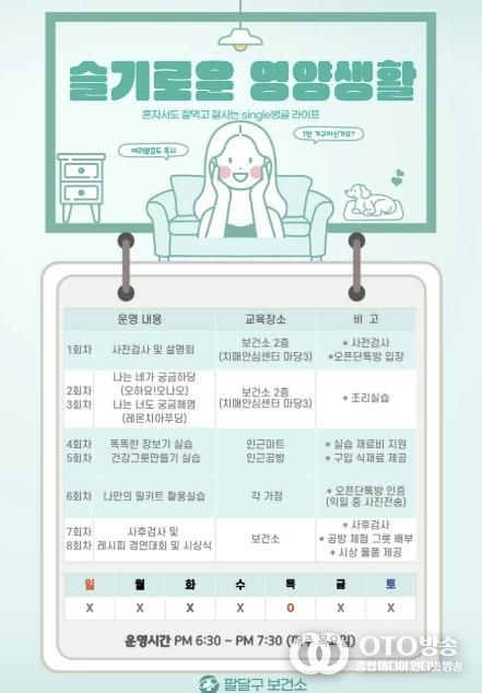 oto방송 김민석 기자 | 수원시 팔달구보건소가 1인 가구와 건강 취약계층을 대상으로 영양 관리 프로그램 ‘나를 위한 한 끼, 슬기로운 영양생활’을 운영한다.